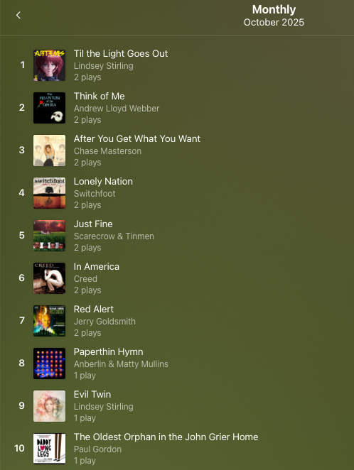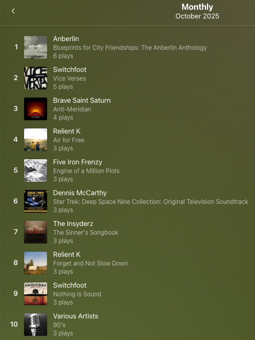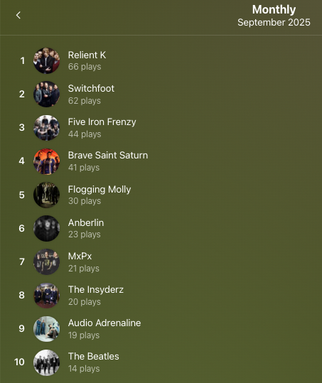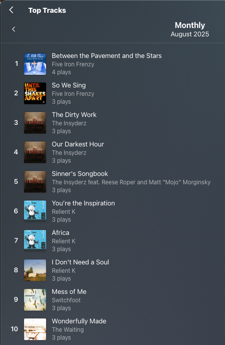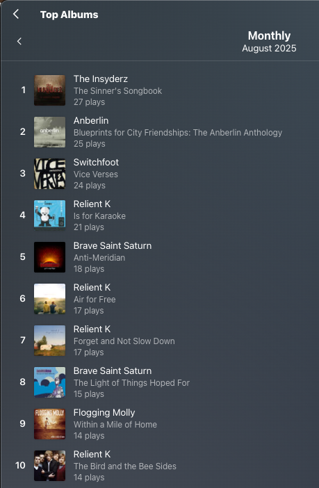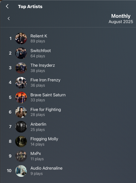 As for songs I am fully convinced that for the most part it doesn’t mean much. Having 2 listens I am sure goes on for a long time but then the program just randomly selects some to put toward the top. It is true that in August I had a 4 play of Between the Pavement and the Stars by Five Iron Frenzy. That is a great song that was on a small EP they put out. I think it could have been a pretty big hit for them if it would have been on one of their full length albums.
